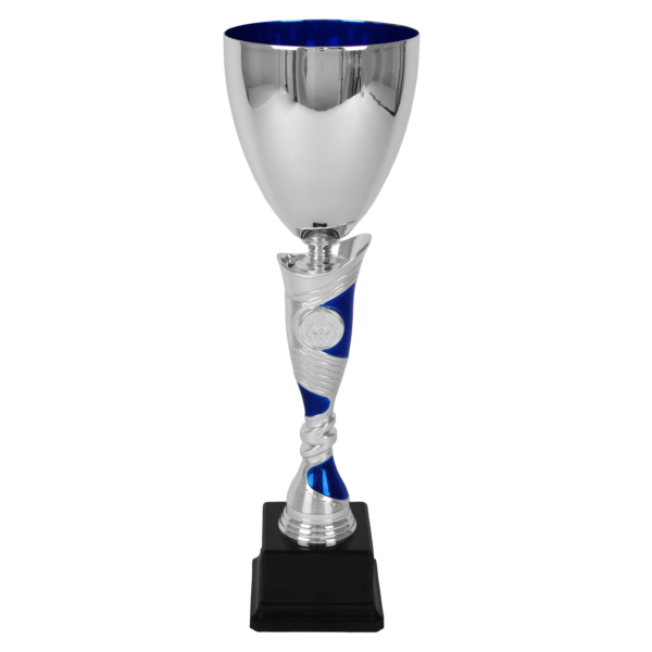 Omschrijving: Prachtige zilveren beker met blauwe accenten. Heb je de binnenkant van deze zilveren cup al gezien? Volledig blauw aan de binnenzijde. Dit zie je nergens! In het fraai vormgegeven middenconsole is er ruimte voor een afbeelding/eigen logo. Onderop de zwarte voet is er ruimte voor een tekstplaatje. Verkrijgbaar in 3 verschillende formaten.
